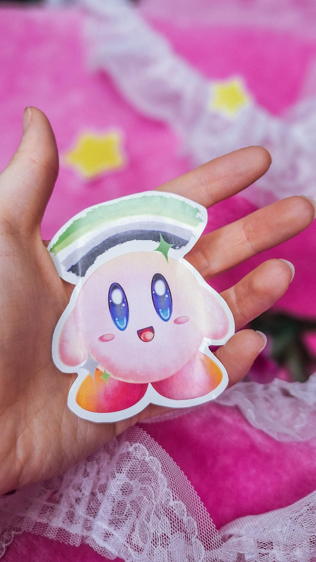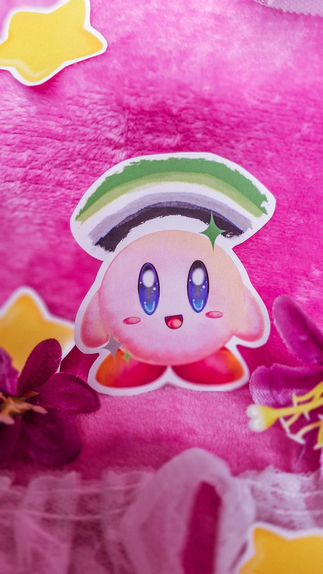 Pegatinas impresas en papel mate con ilustraciones del personaje de videojuegos Kirby con una gran variedad de banderas LGBTIQ+. En este caso muestra la bandera arromántica y las estrellas van a juego con los colores de dicha bandera.