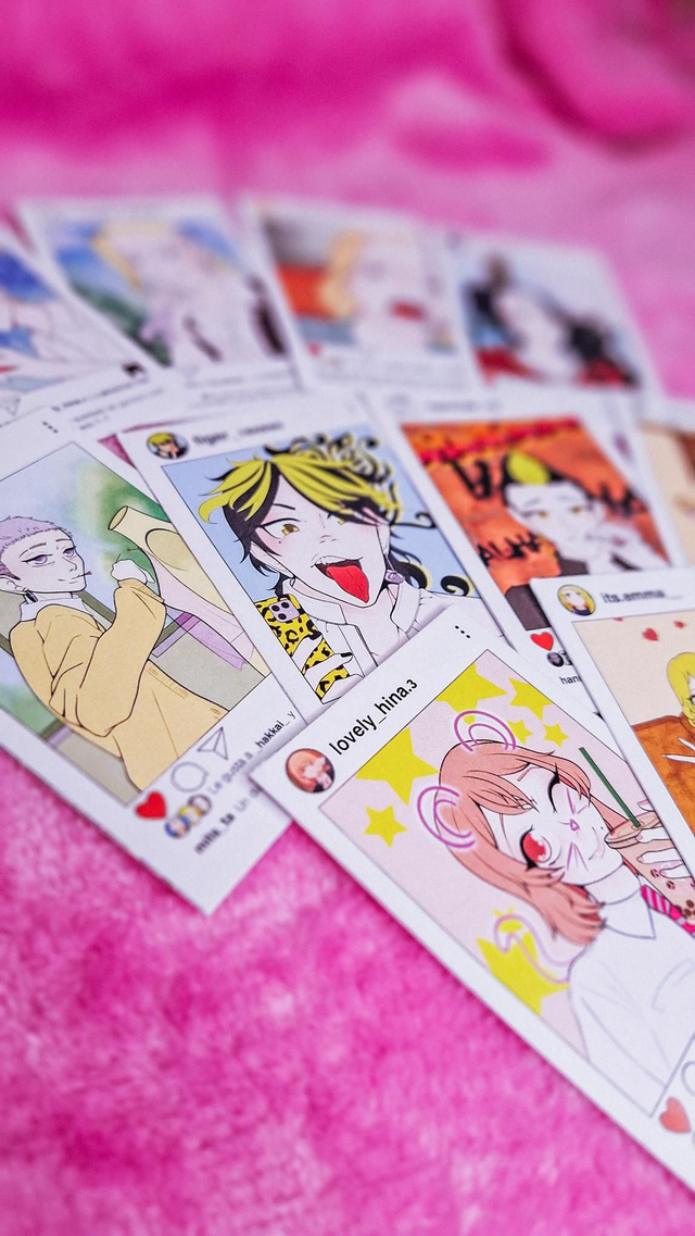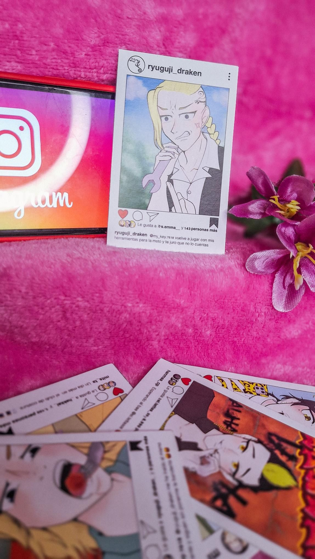 Photocard con ilustración original impresa en papel mate. La ilustración es un fanart que muestra el día a día de los personajes principales del anime "Tokyo Rvengers" en sus redes sociales (Instagram), si las tuvieran. Cada photocard tiene una caption diferente que tiene que ver con la personalidad del personaje que muestra, su nickname también. En este caso se muestra a Draken: @ryuguji_draken "@my_key.7618 vuelve a jugar con mis herramientas para la moto y te juro que no lo cuentas"