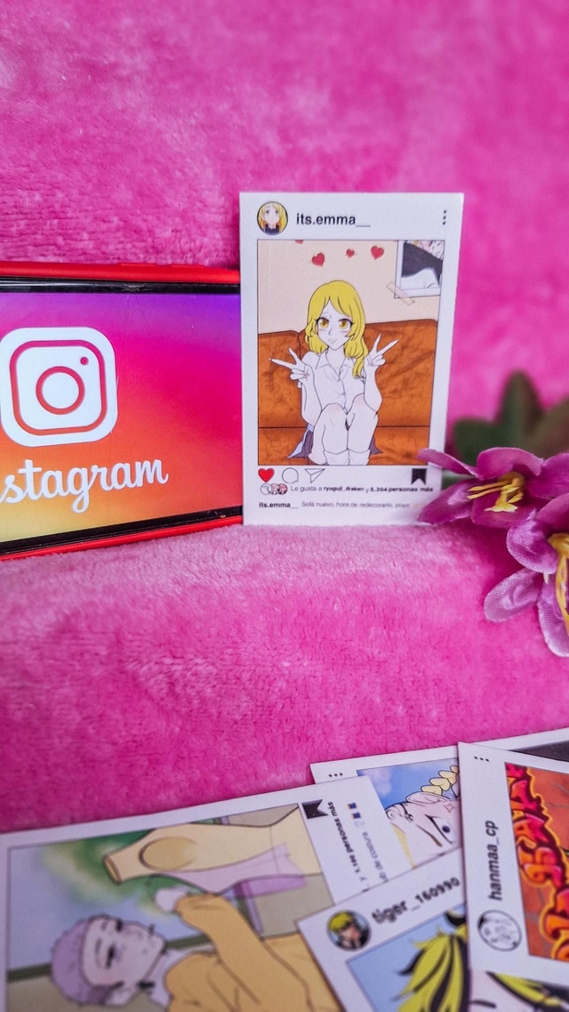 Photocard con ilustración original impresa en papel mate. La ilustración es un fanart que muestra el día a día de los personajes principales del anime "Tokyo Rvengers" en sus redes sociales (Instagram), si las tuvieran. Cada photocard tiene una caption diferente que tiene que ver con la personalidad del personaje que muestra, su nickname también. En este caso se muestra a Emma: @its.emma__ "Sofá nuevo, hora de redecorarlo, poyo ✨✨"