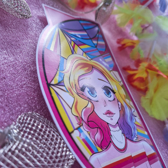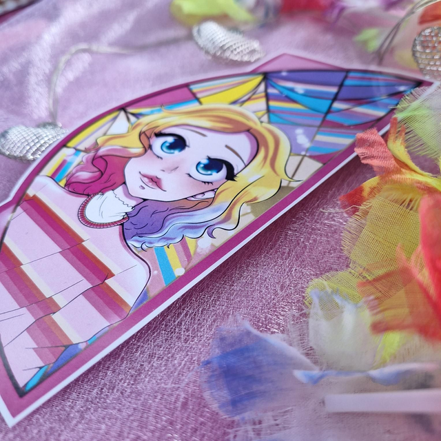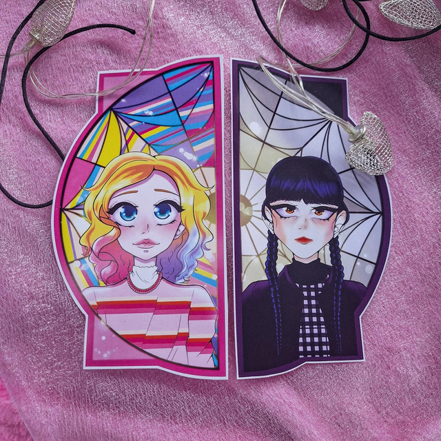 Marcapáginas tamaño A5 impreso en papel mate. Muestra la ilustración de uno de los personajes secundarios más importante y querido de la serie de Netflix Miércoles: Enid Sinclair. Detrás de ella está su respectivo ventanal y, al juntar el marcapáginas con su pareja, forman la cristalera completa.