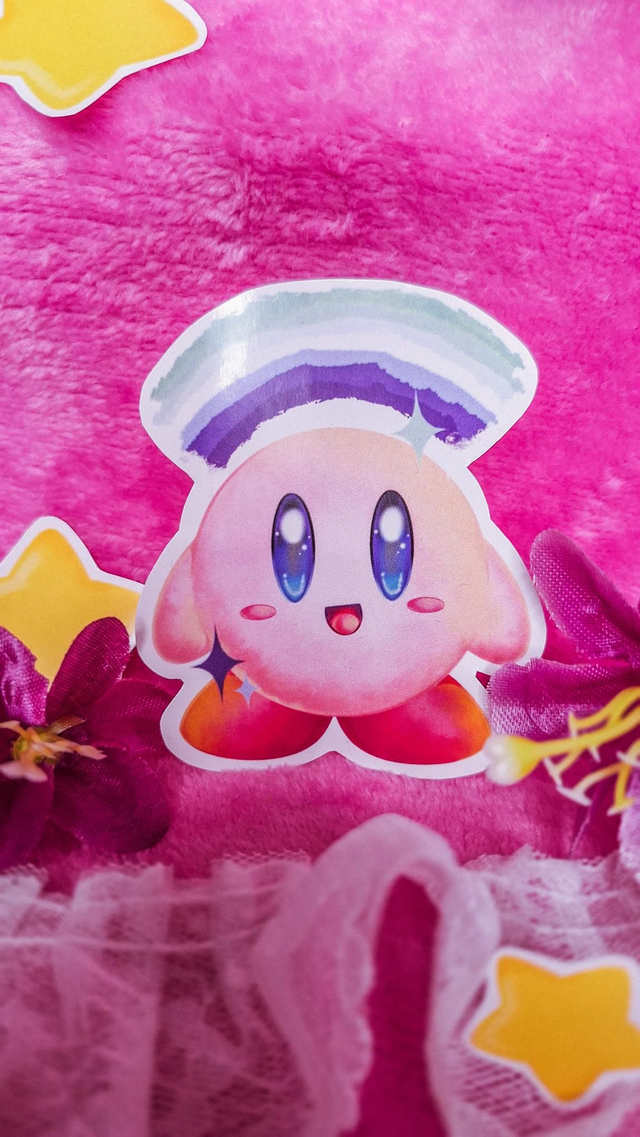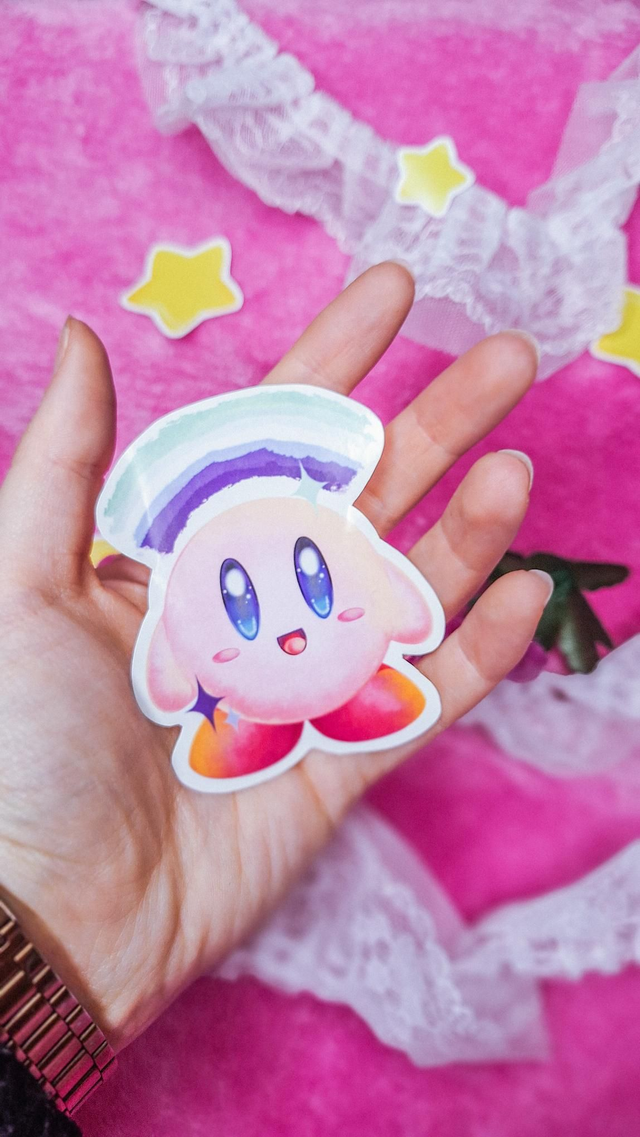Pegatinas impresas en papel mate con ilustraciones del personaje de videojuegos Kirby con una gran variedad de banderas LGBTIQ+. En este caso muestra la bandera gay y las estrellas van a juego con los colores de dicha bandera.