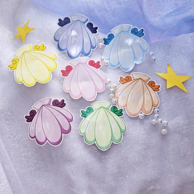 Pegatina impresa en papel mate con la ilustración de la concha del collar de Karen, una de las 7 perlas originales del anime Pichi Pichi Pitch. Las pegatinas tienen un tamaño bastante grande, aproximadamente un palmo.