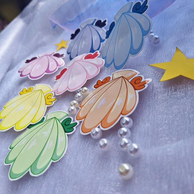 Tres pegatinas impresas en papel mate a elección propia con las ilustraciones de 3 de los collares de las 7 perlas originales del anime Pichi Pichi Pitch: Luchia, Hanon, Rina, Karen, Noel, Coco y Sara/Seira.