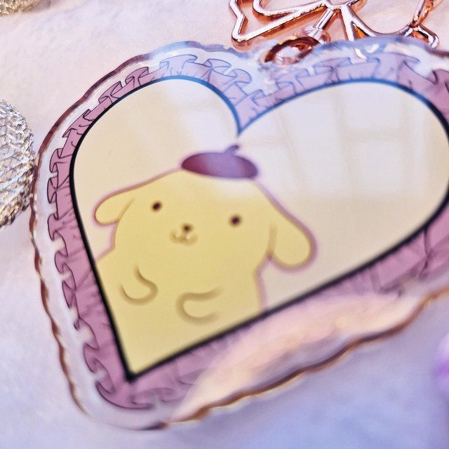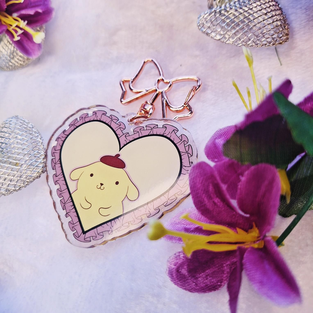 Llavero con forma de corazón y enganche con forma de corazón con ilustraciones de uno de los personajes más queridos de Sanrio: Pompompurin.