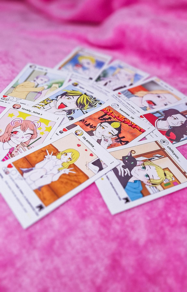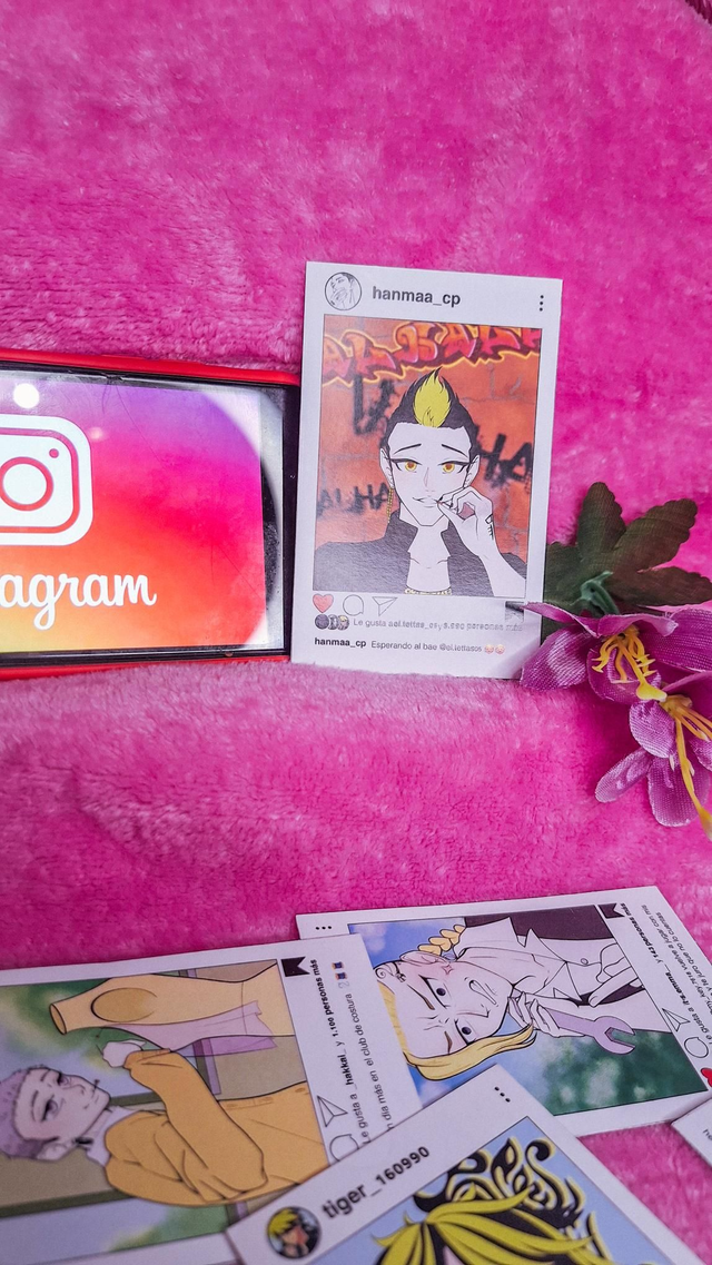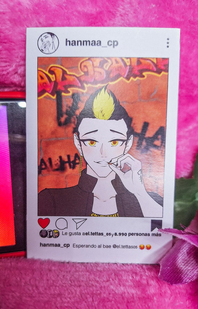 Photocard con ilustración original impresa en papel mate. La ilustración es un fanart que muestra el día a día de los personajes principales del anime "Tokyo Rvengers" en sus redes sociales (Instagram), si las tuvieran. Cada photocard tiene una caption diferente que tiene que ver con la personalidad del personaje que muestra, su nickname también. En este caso se muestra a Shuji Hanma: @hanmaa_cp "Esperando al bae @el.tettas05 🥵🥵"
