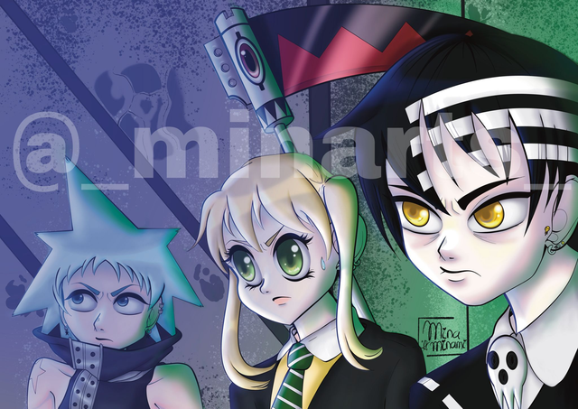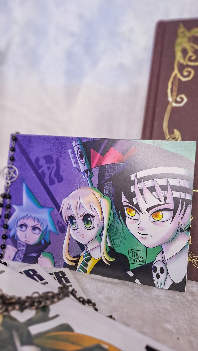 Print tamaño A5 impresa en papel mate. La print muestra una ilustración de los principales personajes, Black✰Star, Maka Albarn y Death the Kid, de la serie de anime japonés "Soul Eater" del autor Atsushi Ōkubo.