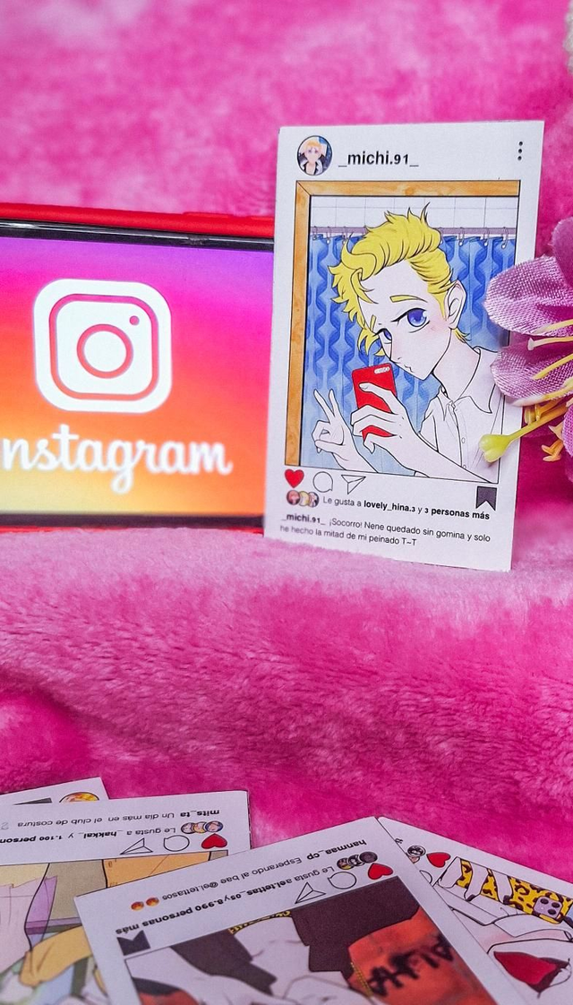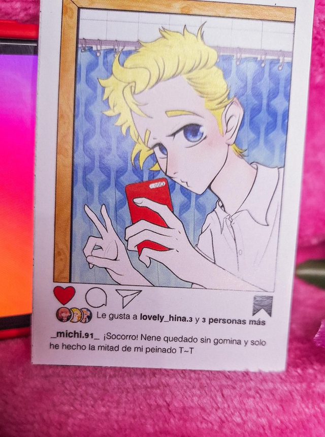 Photocard con ilustración original impresa en papel mate. La ilustración es un fanart que muestra el día a día de los personajes principales del anime "Tokyo Rvengers" en sus redes sociales (Instagram), si las tuvieran. Cada photocard tiene una caption diferente que tiene que ver con la personalidad del personaje que muestra, su nickname también. En este caso se muestra a Takemichi: @_michi.91_ "¡Socorro! Nene quedado sin gomina y solo he hecho la mitad de mi peinado T~T"