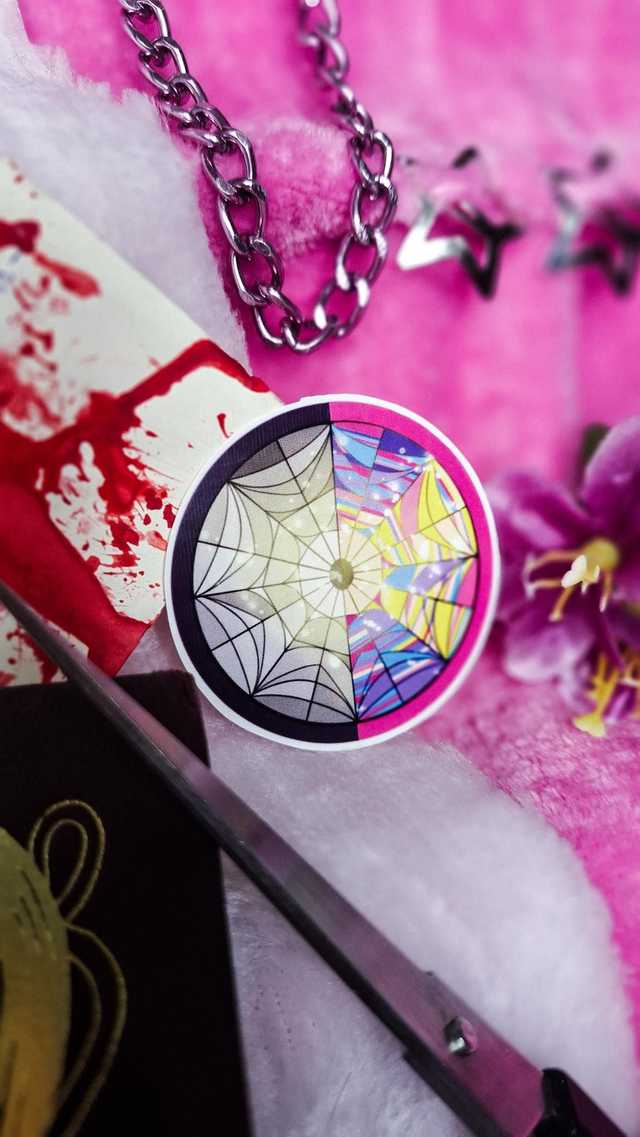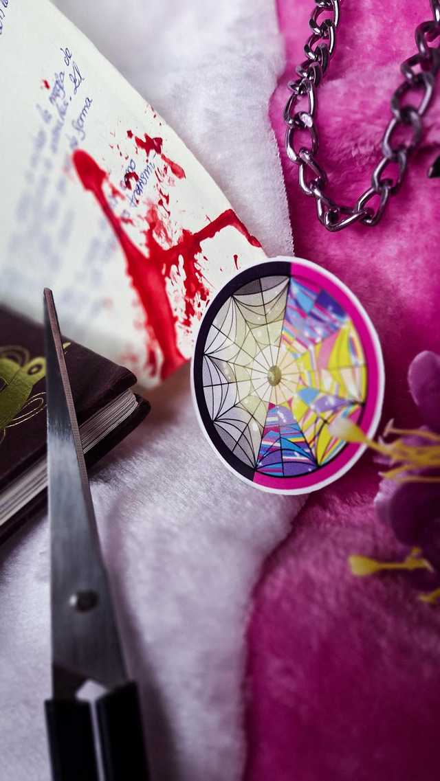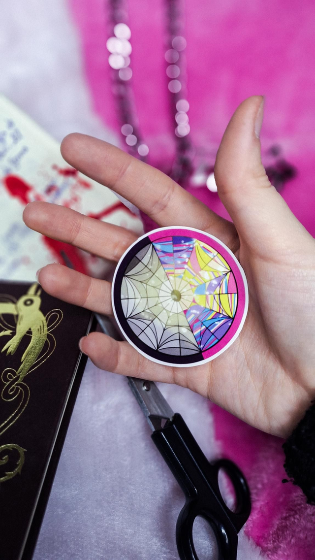 Pegatinas impresas en papel mate con ilustraciones del ventanal de la habitación que comparten Miércoles Addams y Enid Sinclair en la famosa serie de Netflix.