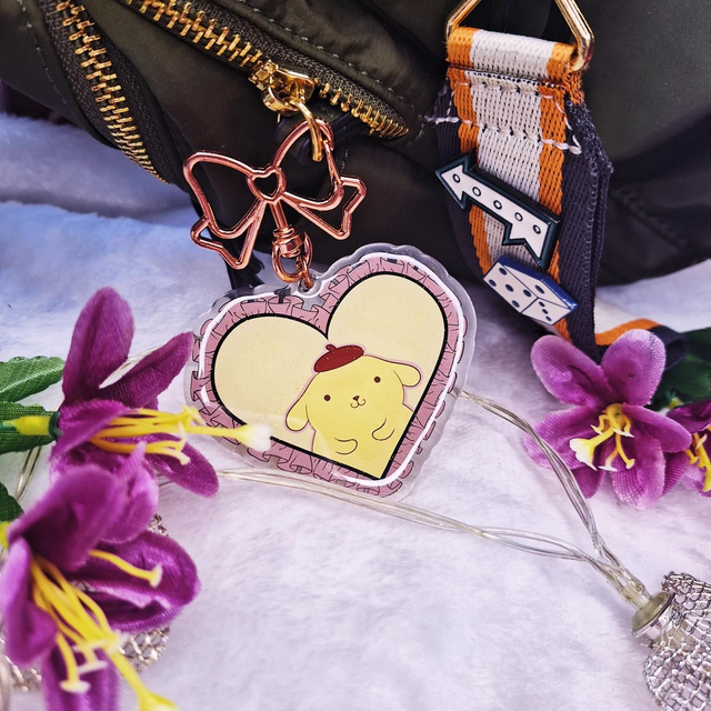 Llaveros con forma de corazón y enganche con forma de corazón con ilustraciones de algunos de los personajes más queridos de Sanrio: Kuromi, My Melody, Hello Kitty, Cinnamon Roll, Pompompurin y Keroppi.