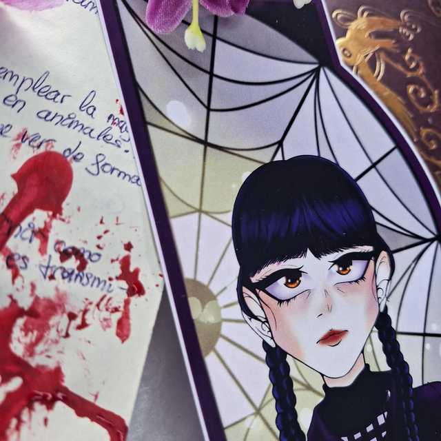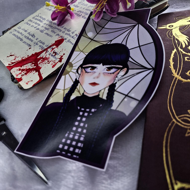 Marcapáginas tamaño A5 impreso en papel mate. Muestra la ilustración de la protagonista de la serie de Netflix Miércoles: Miércoles Addams. Detrás de ella está su respectivo ventanal y, al juntar el marcapáginas con su pareja, forman la cristalera completa.